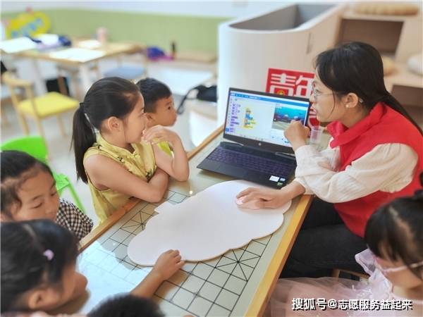 “愿益”实践团队成员带领小朋友体验编程游戏